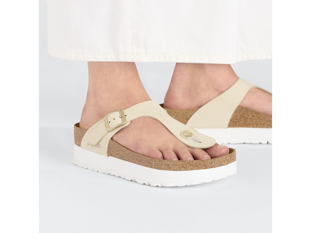 Birkenstock Gizeh PAP FLEX PLATFORM Ecru, skutečná klasika, která kombinuje optimální přilnavost s minimalistickým, módním designem. Nová FLEX podrážka (platforma 2,5cm) těchto legendárních žabek od Birkenstock s anatomicky tvarovanou korkovo-latexovou stélkou má širší patní část pro zvýšenou stabilitu a ideální rozložení hmotnosti. Inovovaný design s horizontálními drážkami v přední části zlepšuje flexibilitu a valivý pohyb. Svršek je vyroben z vysoce kvalitní měkké nubukové kůže, která se může pochlubit přirozeným rustikálním vzhledem.