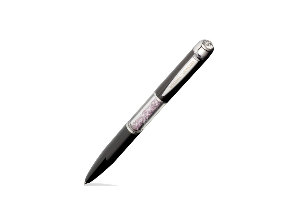Černý roller je zdoben barevným šatonem v hlavici pera a v těle samotného pera - v tzv. tubusu jsou umístěny miniaturní chatonky fialkové barvy (amethyst - Swarovski Elements), které se přesypávají.